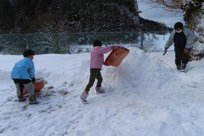 3学期がスタートした一週間は寒波がやってきて、学校周辺にはたくさんの雪が降り積もりました。千屋にも厳しい冬がやってきた感じがします。天気が落ち着いたころ、1・2年生が雪遊びでかまくらを作っていました。一人が入れる小さなかまくらです。冬を満喫していました。