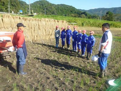 本校の米作りは稲刈りをした後、はでに稲をかけて乾燥させる昔ながらの方法です。2週間ほど乾燥させ、脱穀、精米となります。出来上がったお米は、家庭に持ち帰ったり、地域に販売をする予定です。