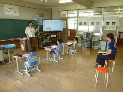 5・6年生が今年度最初のドローンを使ったプログラミング学習をしました。授業には教育委員会の先生や山佐の先生が学校へ来てくださり、指導をしてくださいました。今回の授業では、山佐の先生が大きなドローン持ってきてくださり、操作方法を教えていただきながら子ども達が実際に操作しました。