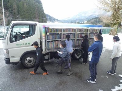 定期的に新見中央図書館から来ている移動図書館車がやってきました。子ども達は本棚から自分好みの本を探し、一人5冊ずつ借りました。朝の読書の時間や休み時間に読む予定です。
