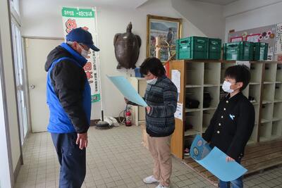 給食週間の取組の一つとして、給食に携わっておられる方々へ感謝状を渡しました。牛乳と給食を運搬してくださっている方です。児童代表の子ども達が感謝の気持ちを伝えて渡しました。これからもよろしくお願いします。