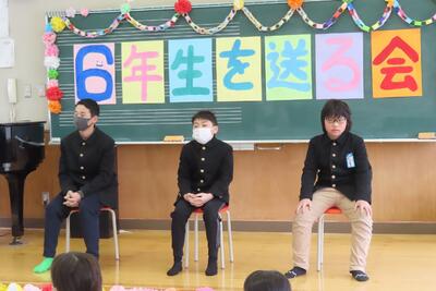 3月5日(水)に6年生を送る会を行いました。6年生への感謝の気持ちや中学校へ行ってがんばってほしいという気持ちを込めて、5年生を中心にみんなで協力して準備してきました。各学級のゲームやダンスなどの出し物やプレゼント渡しなど、どの学級も工夫を凝らしていました。6年生3名はとても嬉しそうで、良い思い出になったことと思います。今度は19日の卒業式に向けてみんなで協力してがんばります。