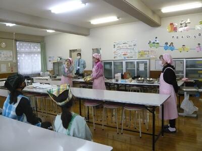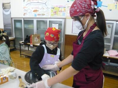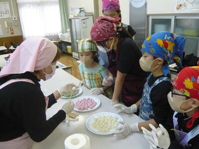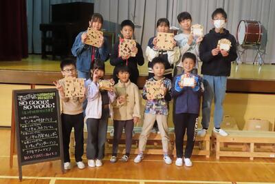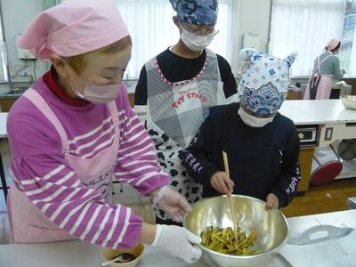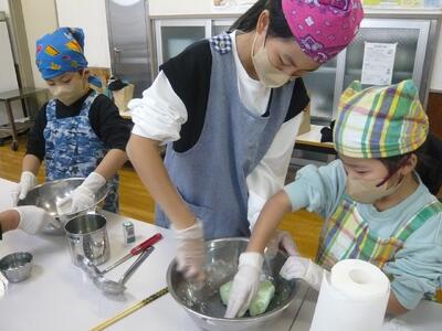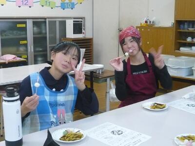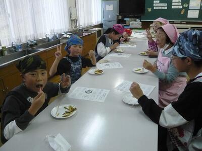 千屋公民館が主催で行っている放課後子ども教室で、料理教室が行われました。講師として地域在住の方3名が来校され、子ども達に料理の指導をしてくださいました。メニューは、3色団子と畑で収穫したサツマイモを使用したフライドポテトです。みんなで協力して料理し、出来上がった料理はみんなでおいしく会食しました。